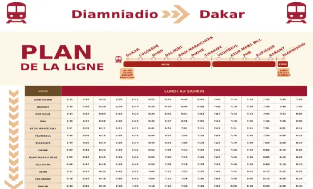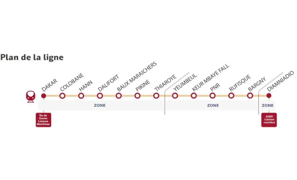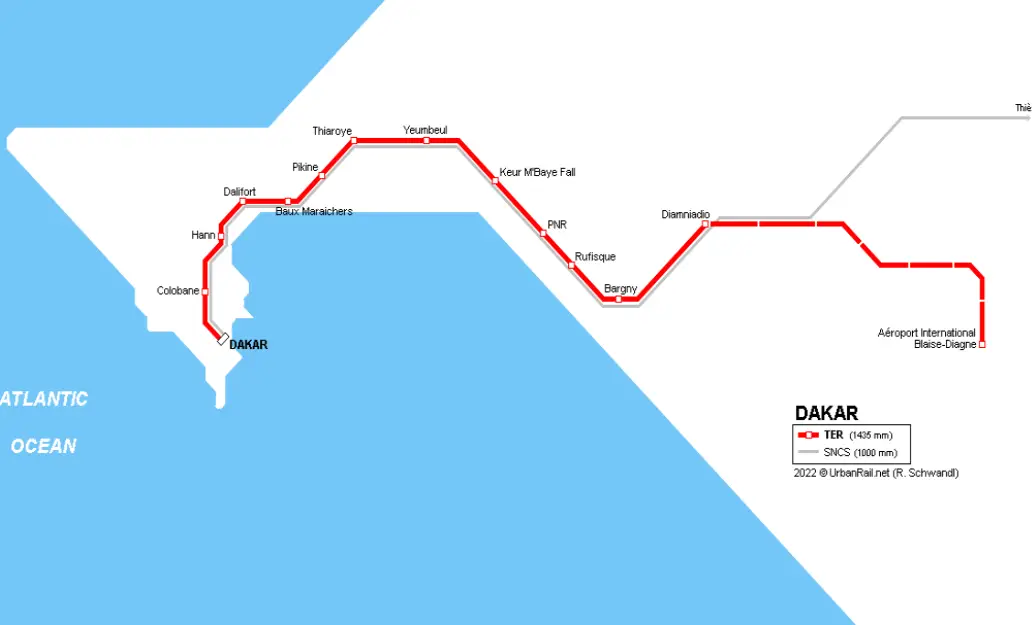 Le Train Express Régional (TER) de Dakar est le principal moyen ferroviaire moderne, reliant la gare de Dakar à Diamniadio en 20-25 minutes (36 km). Il dessert 13 gares (Colobane, Hann, Pikine, Rufisque, etc.) de 5h30 à 22h, avec une fréquence de 10 à 20 minutes. Des extensions vers l'AIBD sont en service.